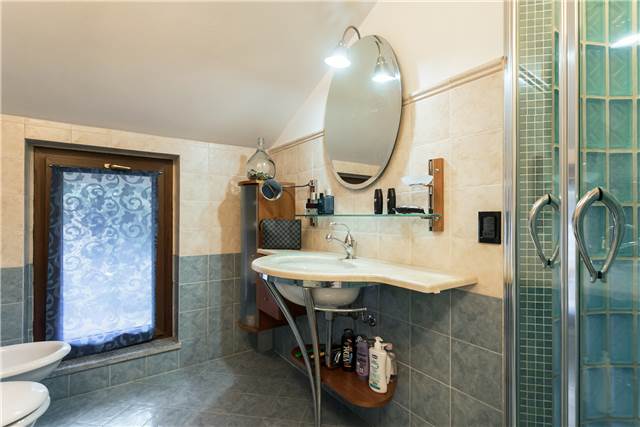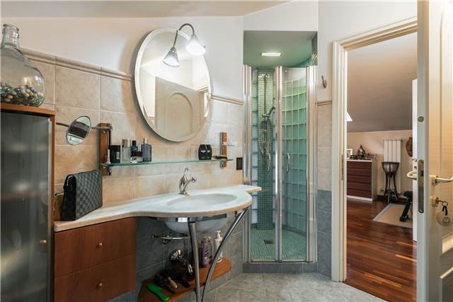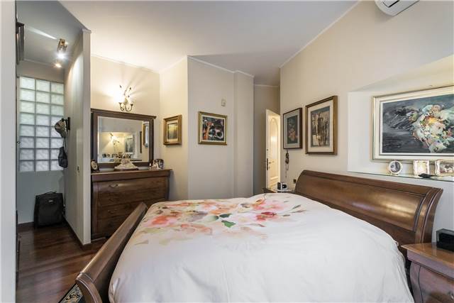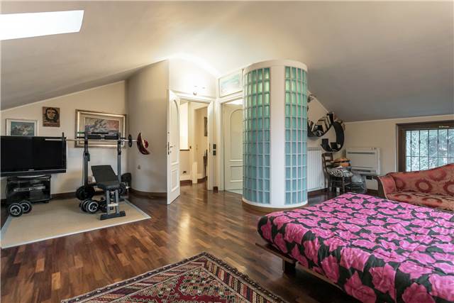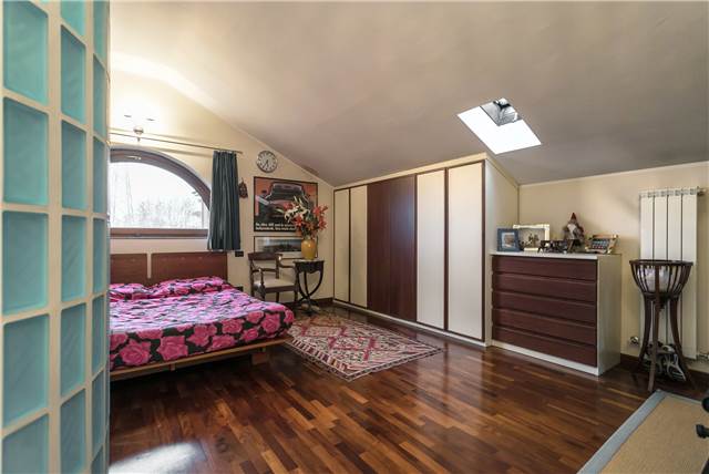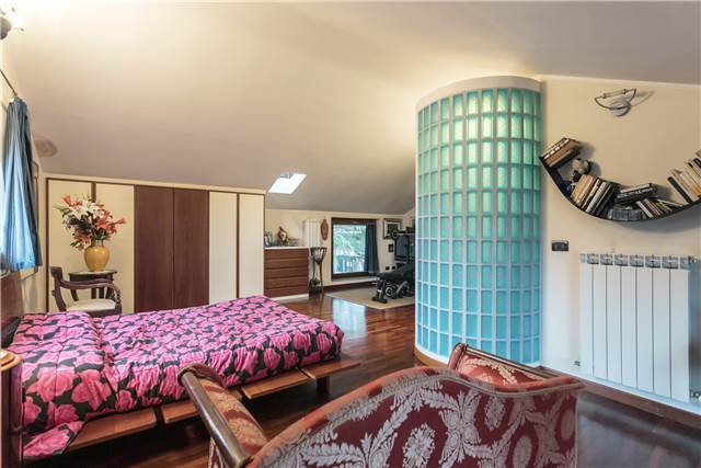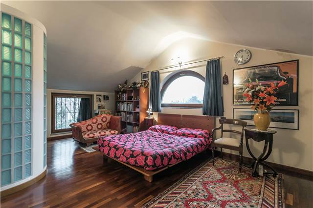 Al piano superiore, anch’esso di circa 95 mq, si sviluppa la zona notte principale. Qui troviamo una spaziosa camera matrimoniale con bagno dedicato, completo di arredi su misura che resteranno nell’immobile.